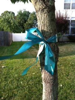 This weekend Littlest Dude and I drove down the road and saw a group of girls tying teal ribbons on trees. About an hour later when we returned, the entire street was lined with teal.
