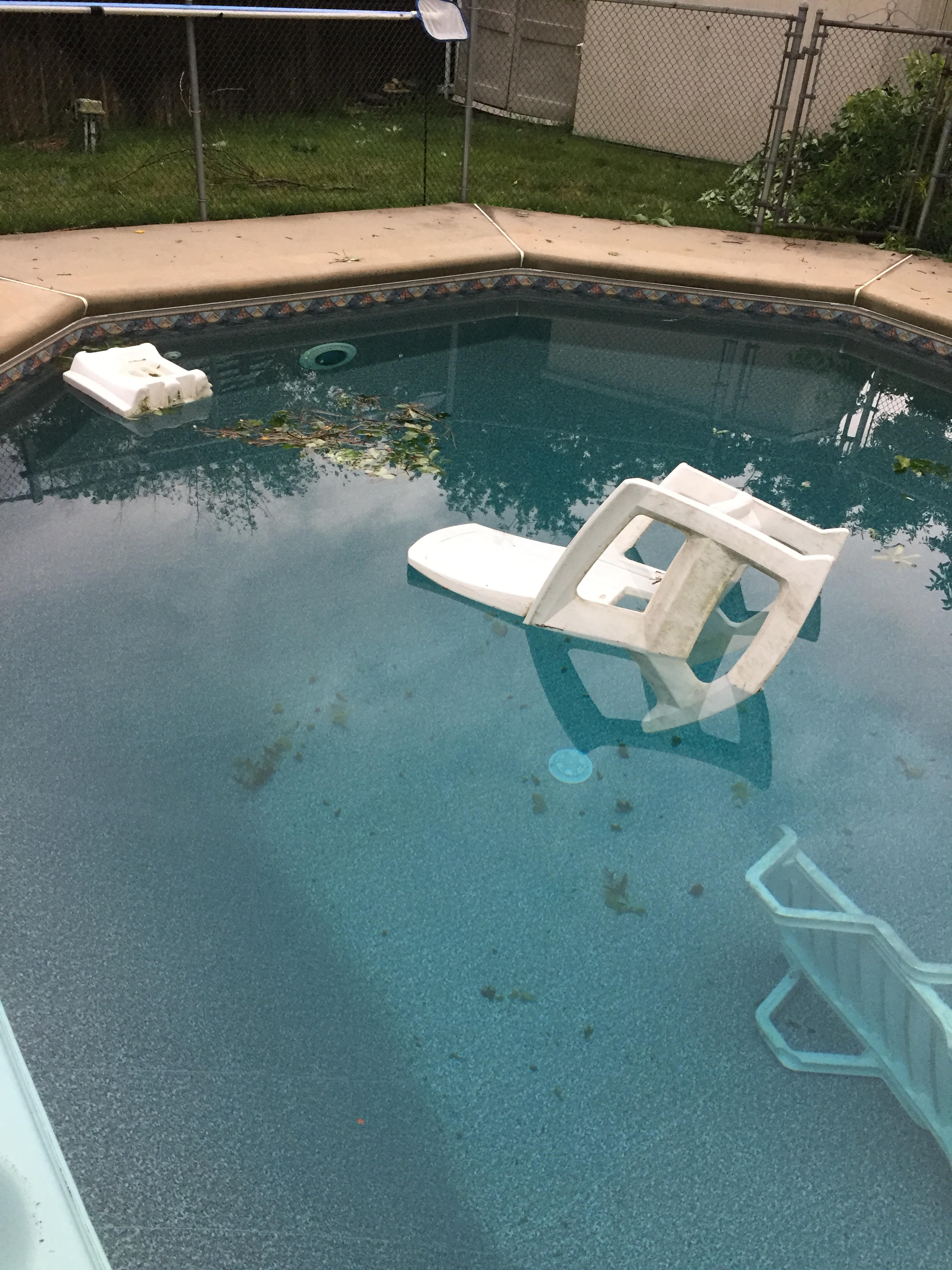 A PVC recliner picked up and spun in the air. A metal table with a closed umbrella flew toward the fence, snapping the wooden umbrella in two.